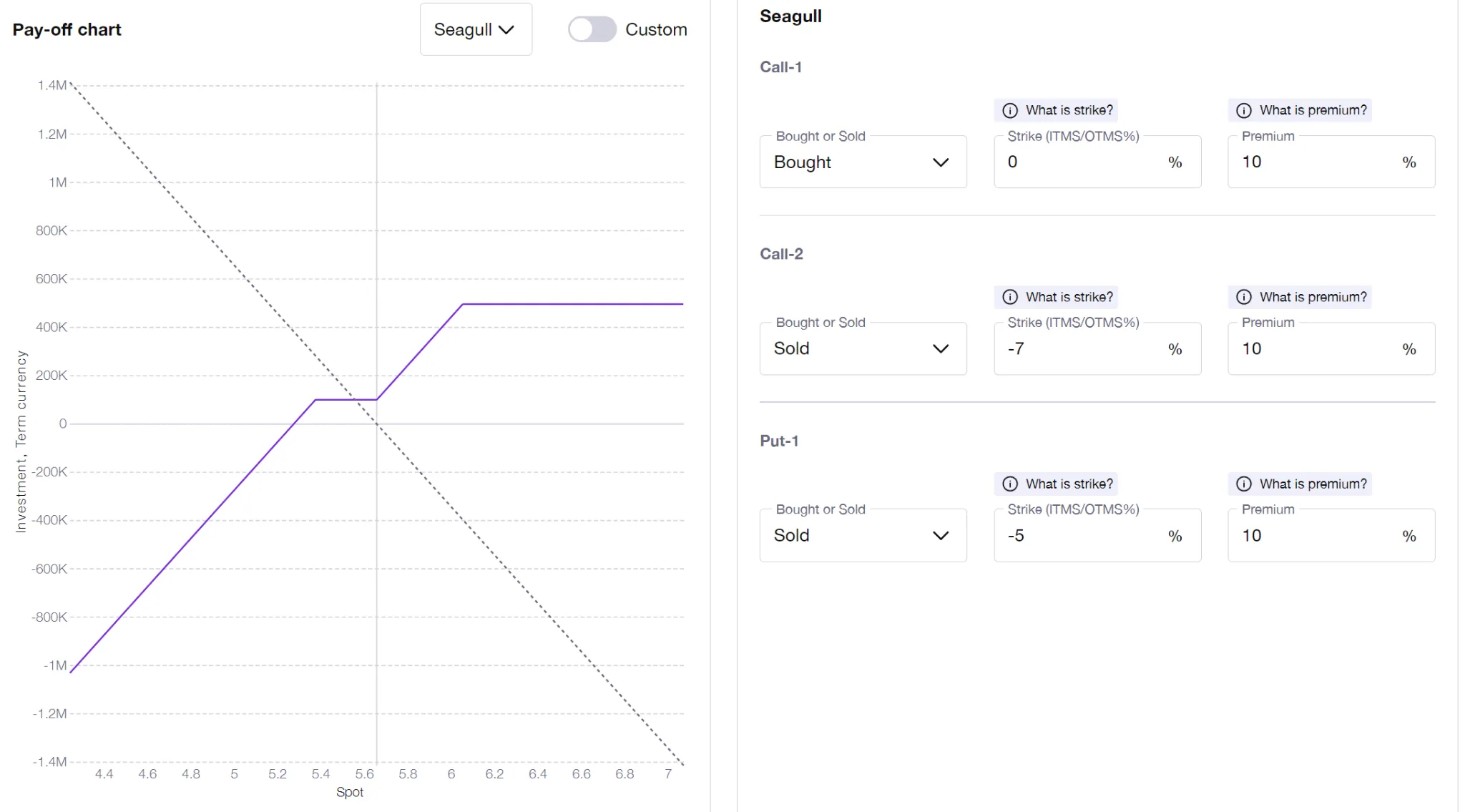 - Seagull Option Strategy A seagull option strategy is a three-legged approach involving the purchase of a put option, the sale of a call option at a higher strike price, and the sale of another put option at a lower strike price. This strategy limits both downside and upside potential within a certain range, reducing the cost of hedging while providing limited protection.