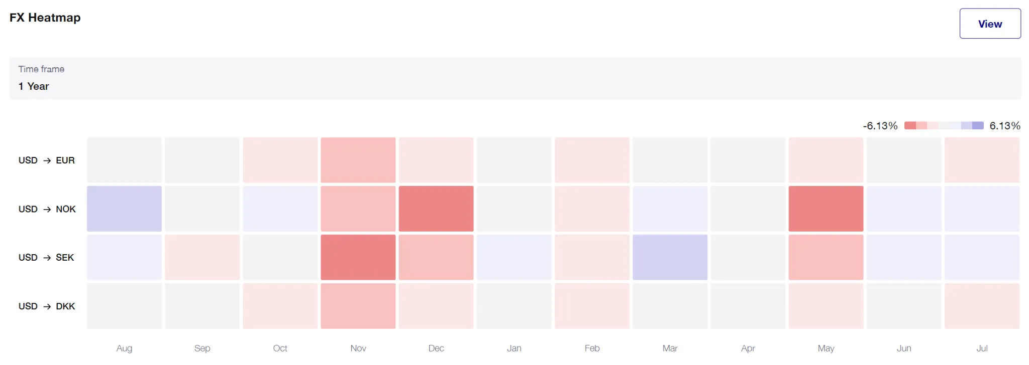 3. FX Heatmap: Visualize the movement of different currency pairs within your portfolio. This tool is valuable for illustrating currency pair trends, with banks often sending such charts to their clients daily.