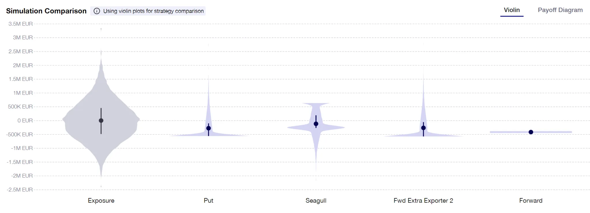 4. Spot History Chart: Analyze currency pair tendencies and calculate volatility with a grey line representing the selected currency pair's variance. Compare this with a blue line illustrating how the currency pair would have moved with a layered hedging strategy.