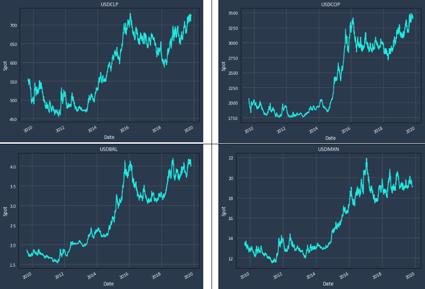 What all of these cross-border investments have in common is currency risk. When an investor or firm acquires an interest in a LATAM entity, the investor's home currency is converted to the local currency. Subsequent growth, revenue and dividends are valued in local currency during the investment period. At the end of the investment term, the value is converted back to the investors home currency. If the spot rate has moved adversely during this period, gains can easily be swamped by currency losses. LATAM currencies are particularly vulnerable to this effect - of the top seven most volatile currencies against the USD, five are LATAM (ARS, COP, BRL, and CLP). Here are the historical spot rates of the most common target investment currencies- they exhibit heightened volatility and trending depreciation: