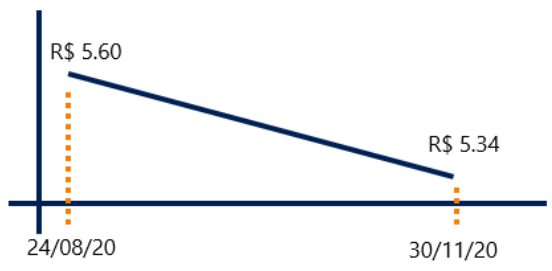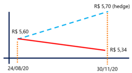 - A estratégia de hedge cambial (NDF) expira contra a taxa spot/PTAX no dia 30/11/20 = R$ 5,34