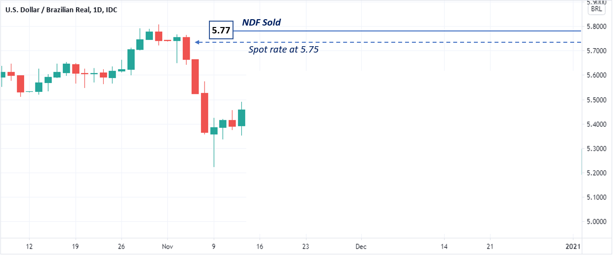With a Forward Contract (NDF), the Brazilian exporter agrees to sell its USD at the Outright Forward Rate of 5.77, which provides full protection against the BRL appreciation of the spot rate, but will not be able to benefit should the BRL further depreciate.