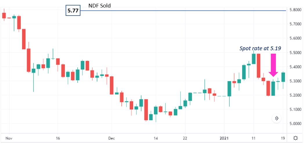 - The hedge strategy (NDF) expires against the spot/PTAX rate on 14/Jan/21 = 5.19