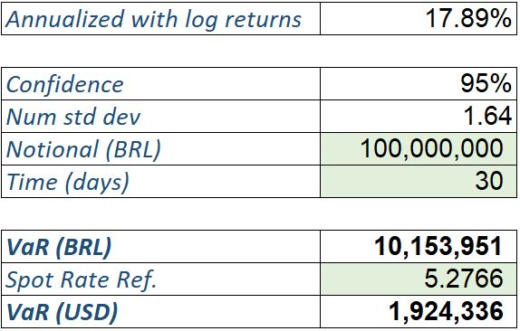 To illustrate how the currency risk could affect the capital call (BRL 100M), the 1-month VaR at 95% confidence level is BRL 10M. This means that with 95% probability the loss in 1 month will not exceed BRL 10M. But this also means that there is a 5% chance of losing more than USD 10M in this 30-day period.