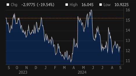 Inflation surged to 6.8% year-on-year in August 2024, well above the South African Reserve Bank's (SARB) target range. The increase is primarily due to rising food and energy costs, coupled with a weaker South African rand (ZAR). Core inflation, which excludes volatile food and energy prices, also climbed to 5.4%, indicating more pervasive price pressures. Despite this, recent declines in oil prices have eased inflation expectations, with the five-year breakeven rate dropping to 4.43%, below SARB's target of 4.5%. This trend has boosted sentiment around South African Government Bonds (SAGBs), leading to strong inflows at recent bond auctions, where demand has exceeded supply fivefold.