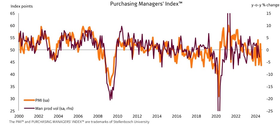 The South African Purchasing Managers' Index (PMI) fell below the critical 50-point threshold, dropping from 51.1 in July to 49.5 in August 2024. This decline signals a contraction in the manufacturing sector, driven by challenges like supply chain disruptions, high input costs, and ongoing load shedding, which have all contributed to reduced business activity and weaker demand conditions.