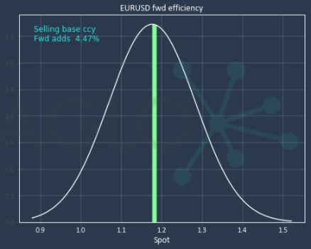 Let's first look at EURUSD, where the hedger is selling EUR and buying USD, the forward points are smallish, and in the hedger's favor. With a spot rate 1.1784, an 18-month forward rate of 1.1932, and volatility of just 8%; using a forward contract locks in an additional 4.47% more value than chance.